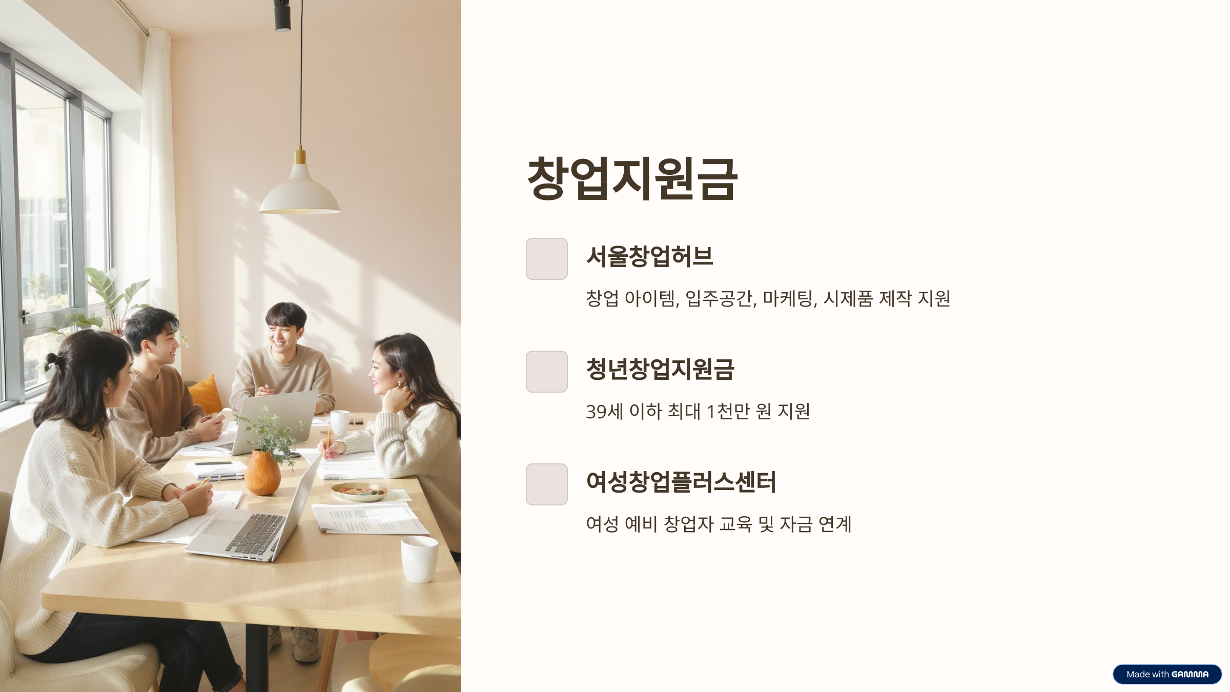 - 서울창업허브 지원사업: 창업 아이템 검증부터 입주공간, 마케팅, 시제품 제작까지 폭넓게 지원
