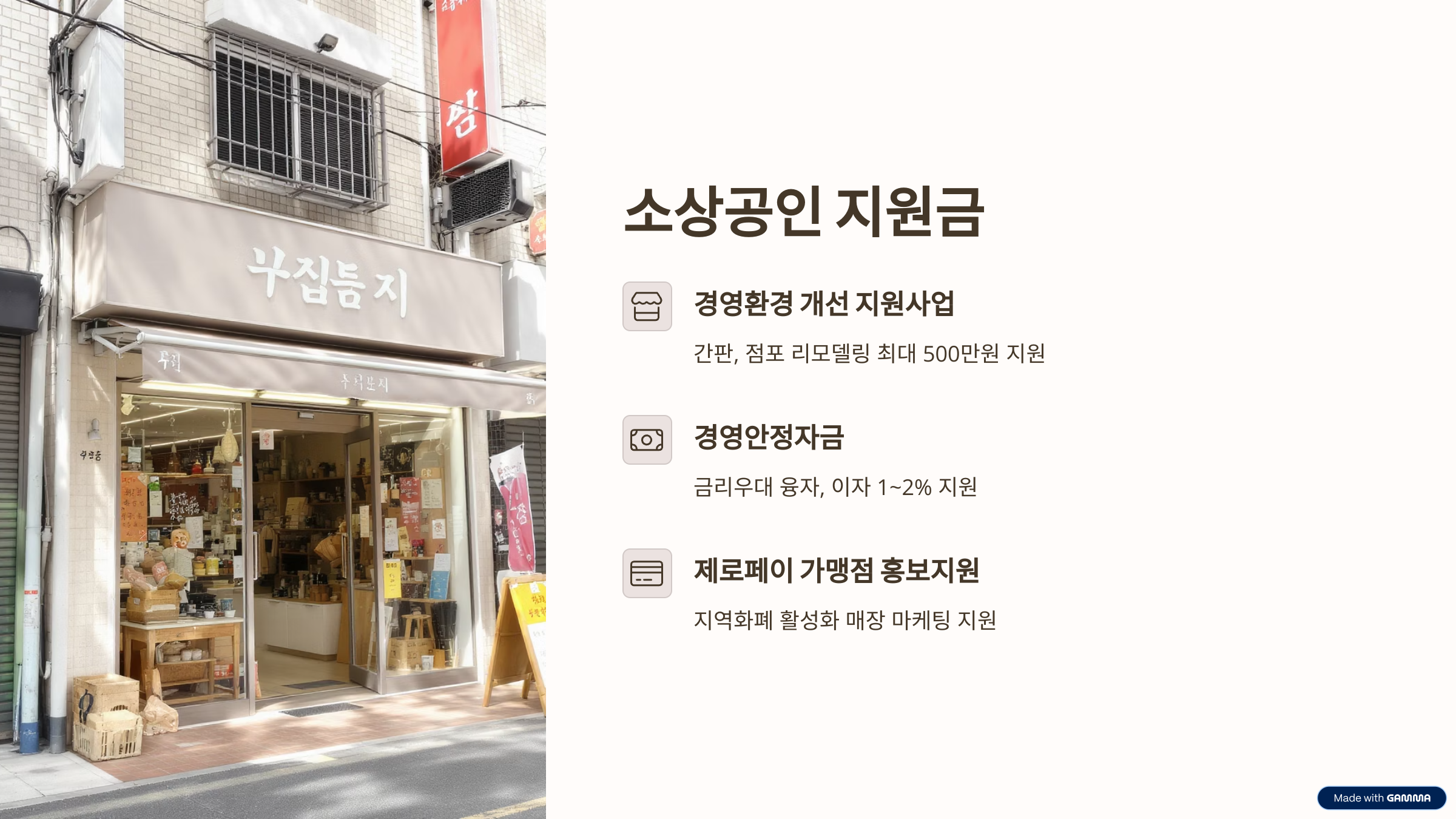 낙후된 간판, 노후화된 점포 내부 리모델링 비용 일부 지원 (최대 500만 원 내외)